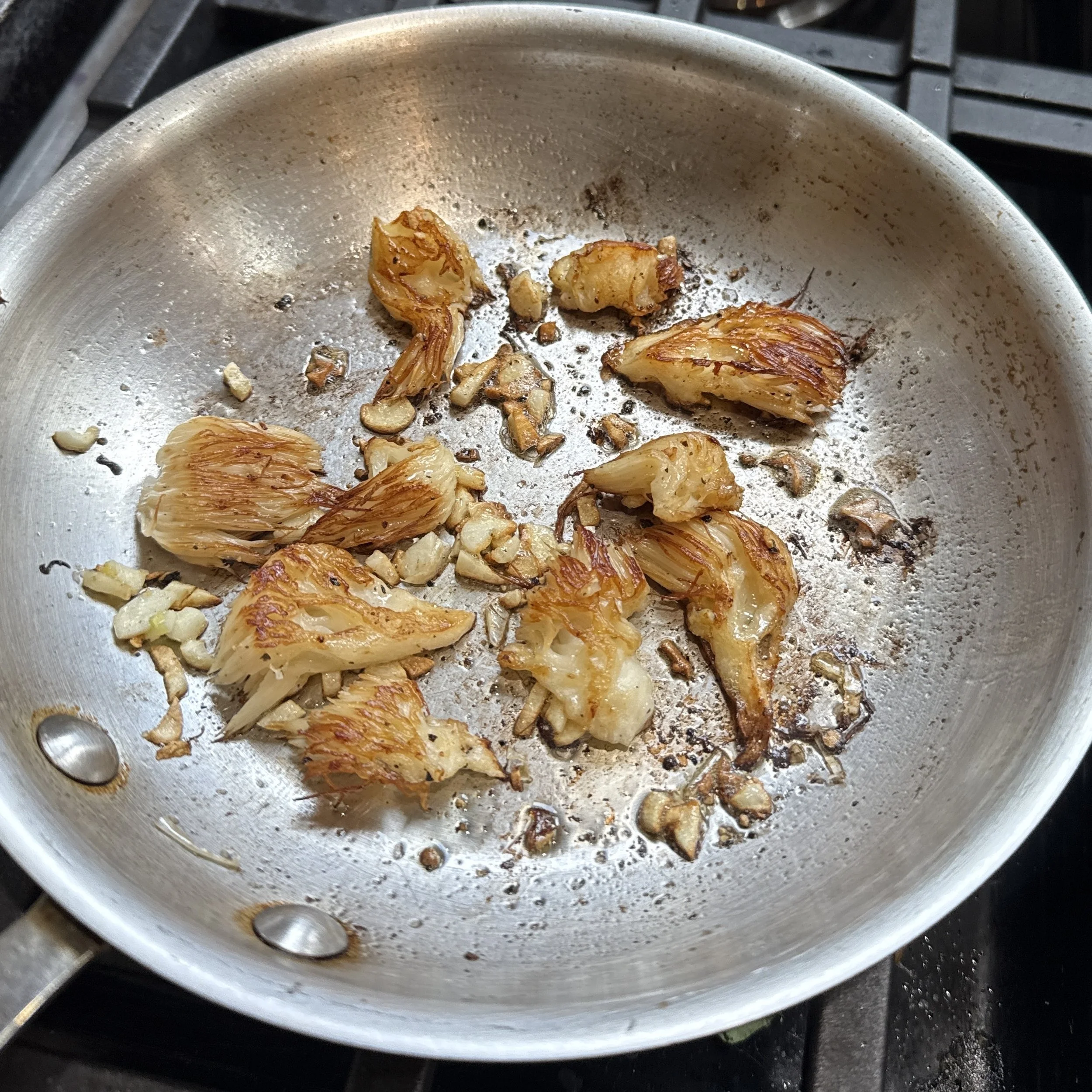 Dry sauté: Heat a skillet over medium-high. Add the torn lion’s mane and cook dry until it releases its water and the liquid mostly evaporates.